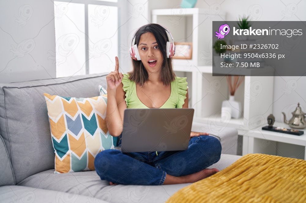 Hispanic young woman using laptop at home pointing finger up with successful idea. exited and happy. number one.
