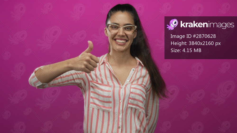 Hispanic young woman wearing eyeglasses shows thumbs up gesture in bright pink studio with smiling expression; confidence.