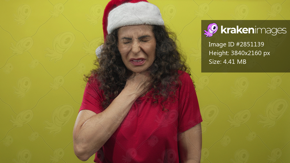 Hispanic young woman wearing santa hat with hand on neck showing sore throat pain in yellow studio; discomfort.