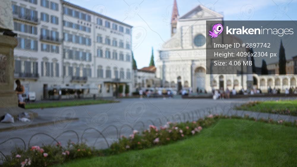 Historic church facade defocused and soft in a sunlit square with foreground flower beds and lawn; background calm.