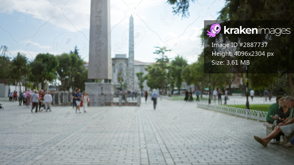 Historic plaza defocused soft bokeh with obelisk, trees and broad paved walkway in shallow focus; backdrop copyspace calm.