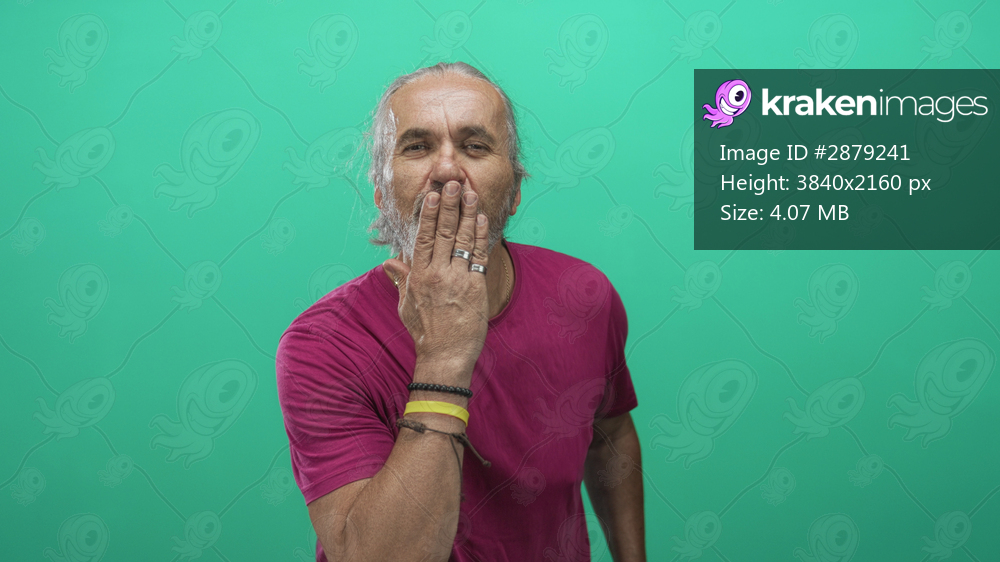 Hoary man with long hair blows a kiss with outstretched hand toward camera in studio against vivid green backdrop; joy warmth connection.