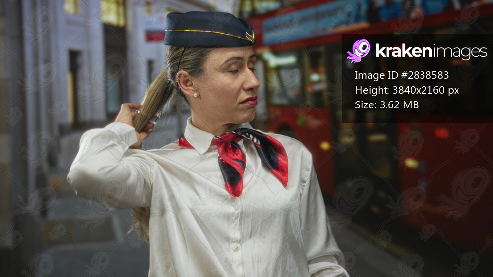 Hostess adjusts her navy cap and red scarf on a busy city street with a passing double decker bus; calm determination.