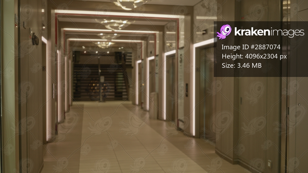 Hotel corridor with elevators and stairs, softly defocused interior; background backplate copyspace calm.