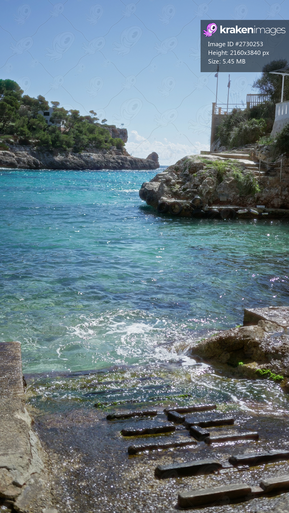 Idyllic mallorcan coastal scene in santanyi featuring clear turquoise water, picturesque rocky shoreline, and lush greenery under a bright blue sky in a serene beach setting. - Kraken Images