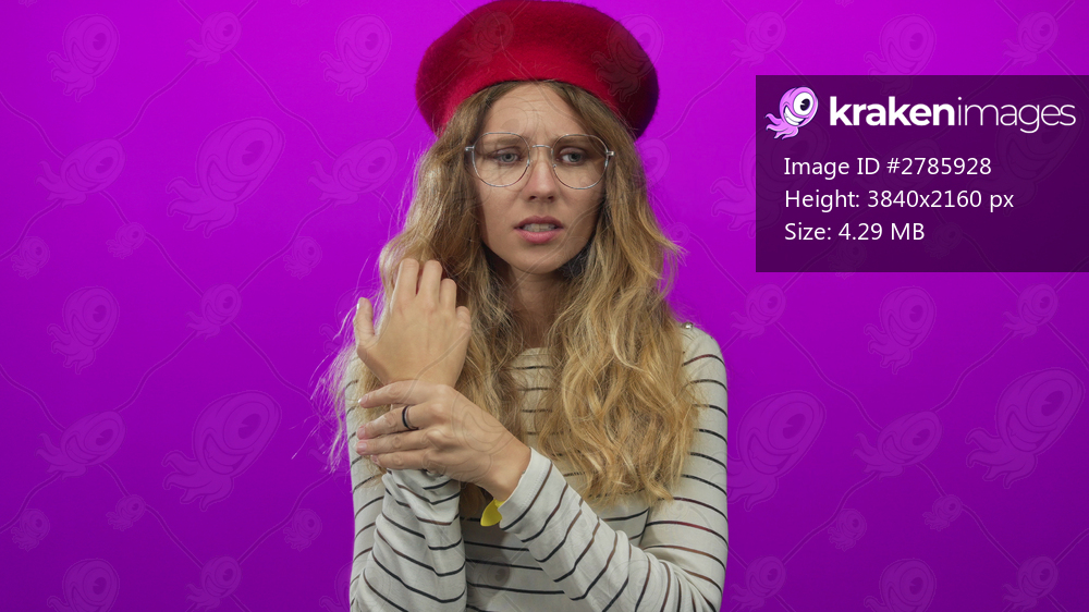 Image captures woman inspecting her wrist and examining in a studio where blonde young style meets beret, sweater, glasses on a purple background.