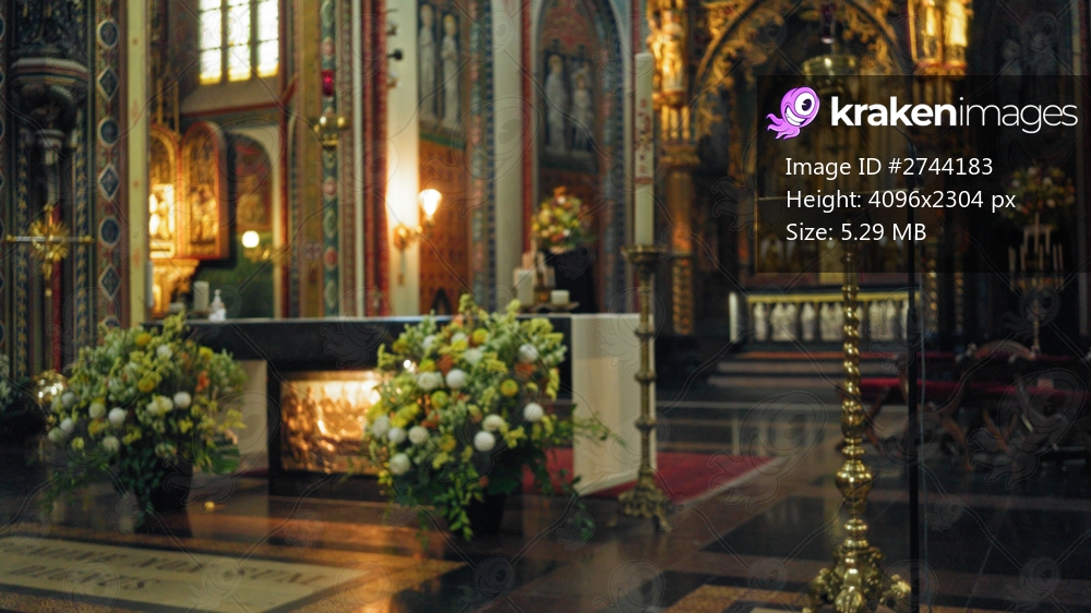 Indoor view of a richly decorated catholic church with blurred altar, beautiful floral arrangements, ornate architecture, and soft bokeh illumination creating a serene atmosphere. - Kraken Images
