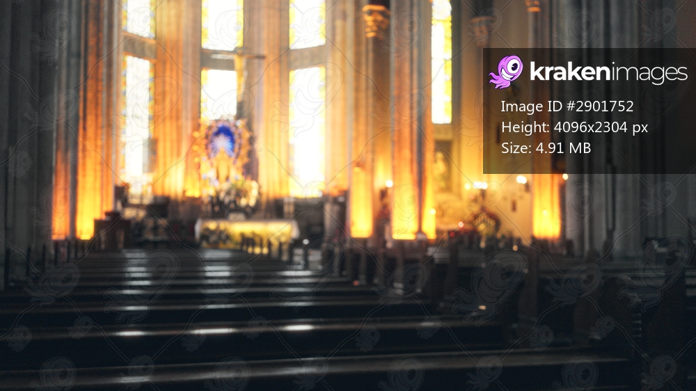 Interior church nave in shallow defocused bokeh with pews and glowing stained glass altar, warm light; background copyspace template overlay.