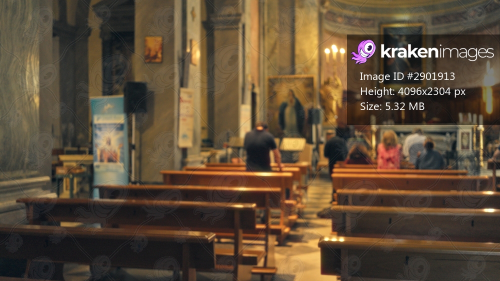 Interior church scene with wooden pews, altar and softly defocused bokeh background church; background copyspace backplate calm.