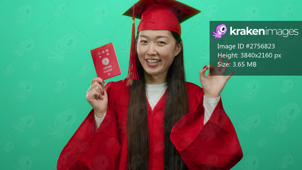Japanese woman in red graduation gown proudly displays japan passport against green background, symbolizing educational achievement and international travel opportunities. - Kraken Images