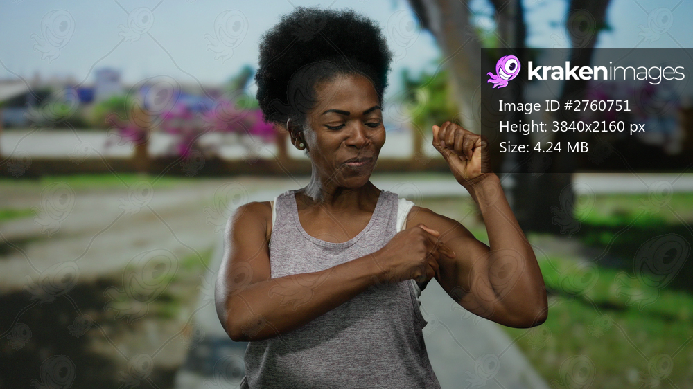 Joyful woman flexing muscles outdoors at a park, showcasing strength and confidence on a sunny day with vibrant background flora.