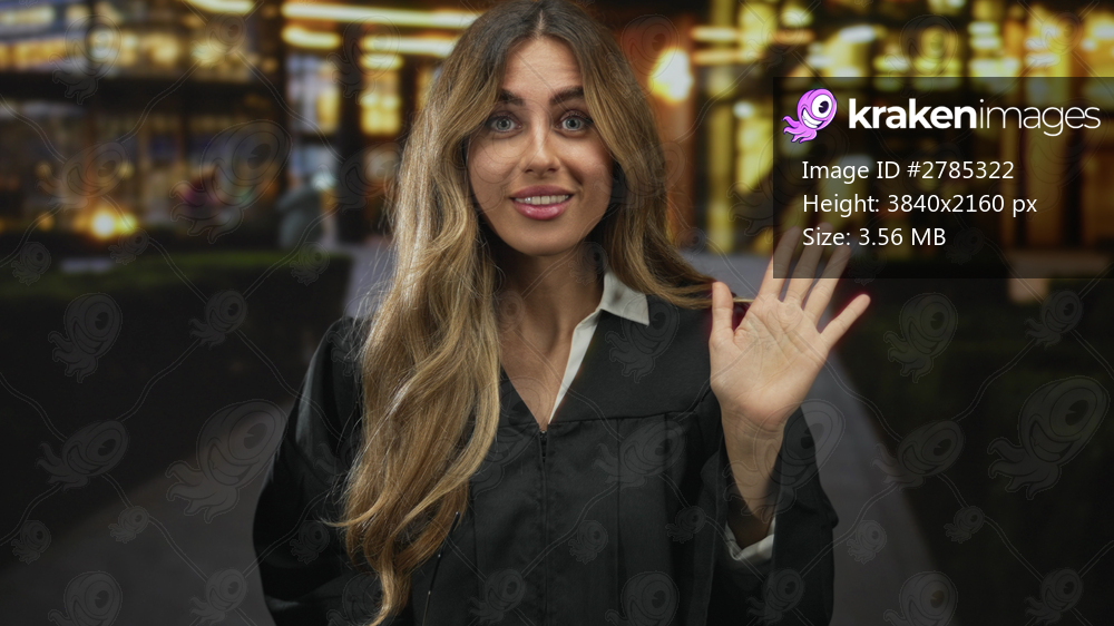 Judge robed woman presses finger to lips for silence in illuminated outdoor courtyard at night; authority secrecy.