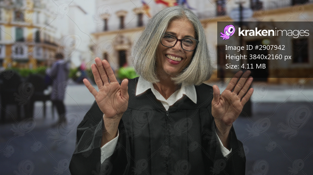 Judge woman claps hands on street in front of a historic building, wearing judge robe and smiling with clasped hands; joy celebration gratitude.