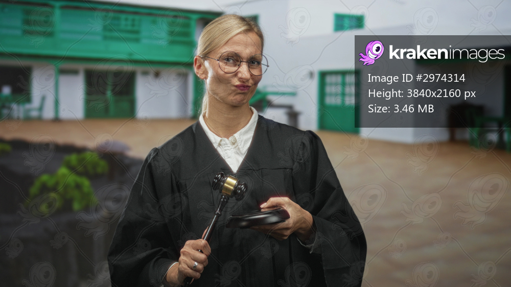 Judge woman holds gavel and sound block, hands visible while smirking in courthouse building; amused authority.