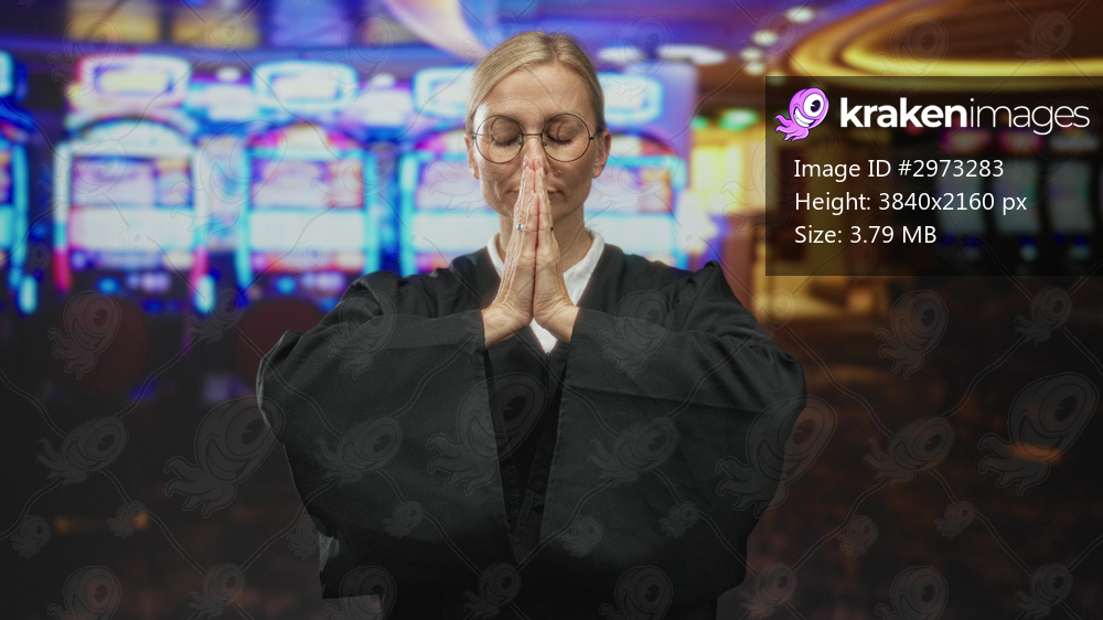 Judge woman in black robe presses palms together in prayer, eyes closed, glasses and ring visible, standing before slot machines inside a gaming building; contemplation. - Kraken Images