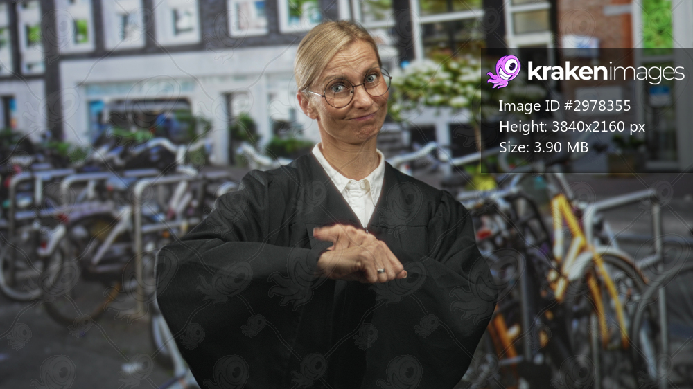 Judge woman in black robe tapping wrist and raising finger on street beside bicycle racks; wry authority patience.