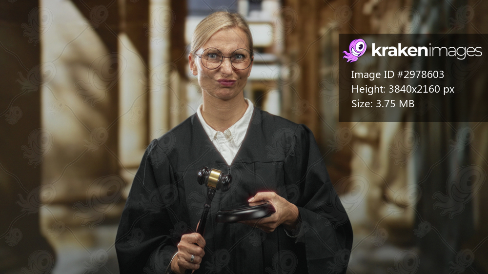 Judge woman in robe holds gavel and sound block, hand poised and lips pursed in a courthouse building hallway; stern authority.