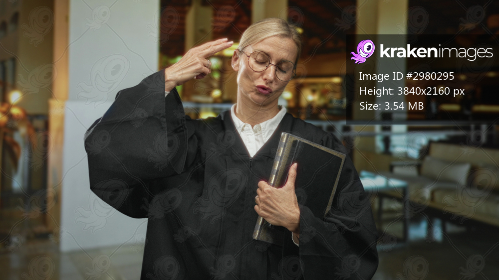Judge woman middle age blonde holds law book and points two fingers to temple in building foyer; skepticism.