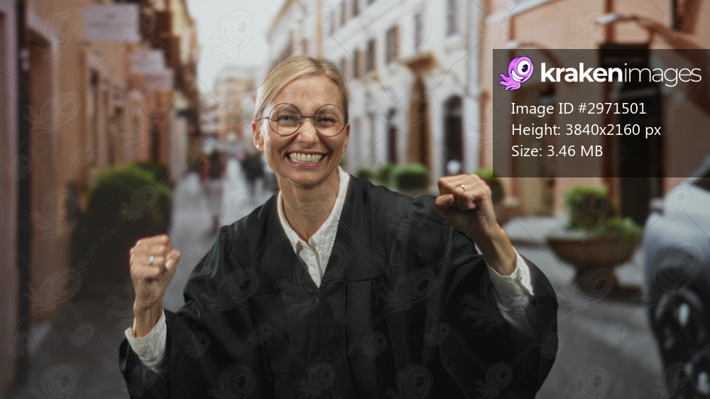 Judge woman, middle aged blonde with glasses, raising clenched fists and smiling in judicial robe on a narrow street; triumph celebration.