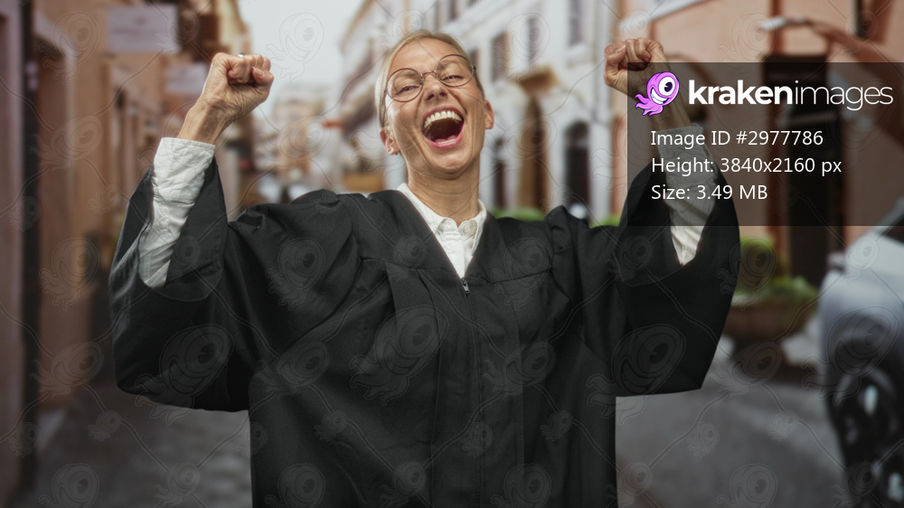 Judge woman, middle aged blonde with glasses, raising clenched fists and smiling in judicial robe on a narrow street; triumph celebration.