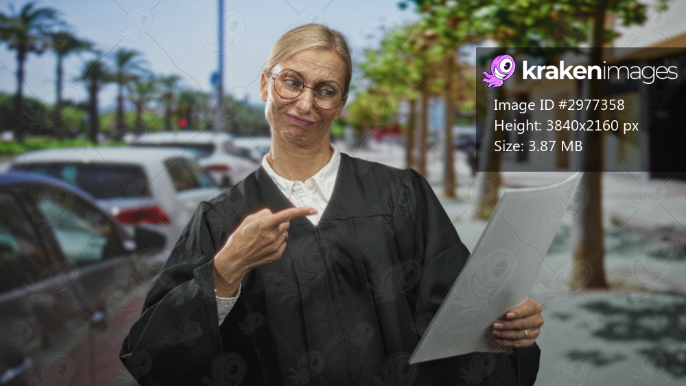Judge woman middleaged blonde wearing black robe points finger at document while reading on sunny street lined with cars and storefronts; confidence deliberation. - Kraken Images