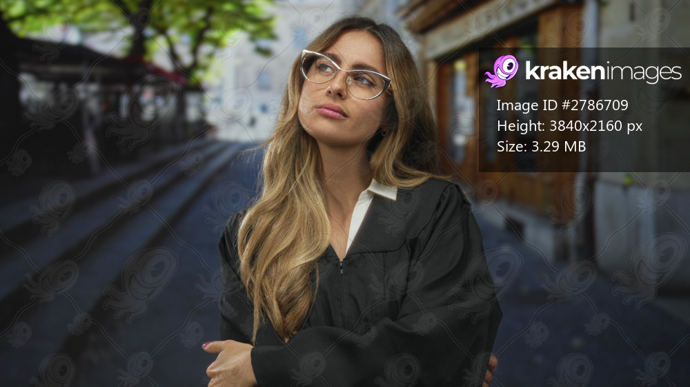 Judge woman wearing black judicial robe rests chin on hand on cobblestone plaza; reflection deliberation seriousness.