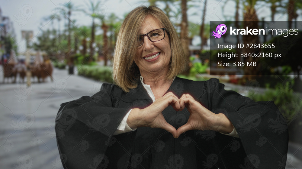 Judge woman wearing black robe forming heart shape with hands on street while smiling; love trust unity empathy.