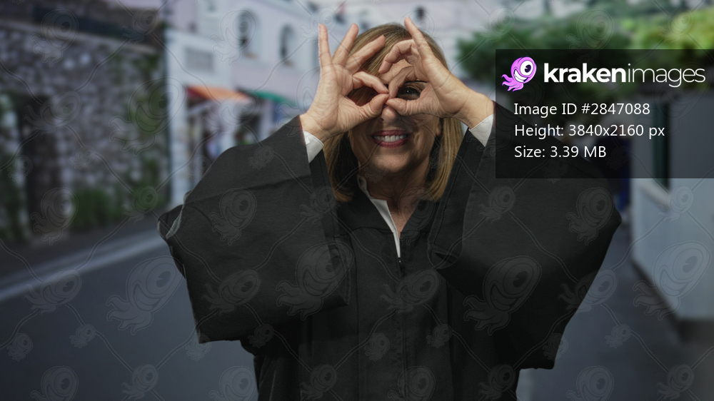 Judge woman wearing black robe frames eyes with hand binoculars on busy street while smiling broadly; curiosity.
