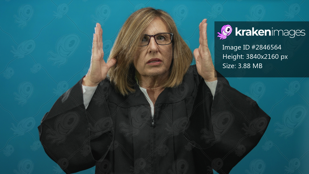 Judge woman wearing black robe raises hands framing face showing shocked expression in teal studio scene; surprise.