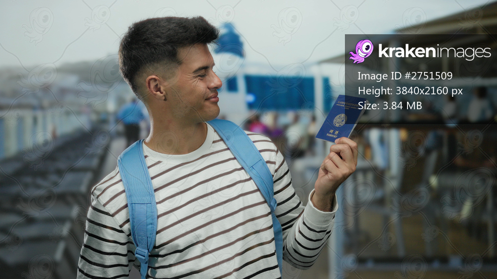 Korean man smiling holding passport on cruise deck outdoors wearing backpack showcasing travel adventure with blue sky and sea in background elevating tourism theme - Kraken Images