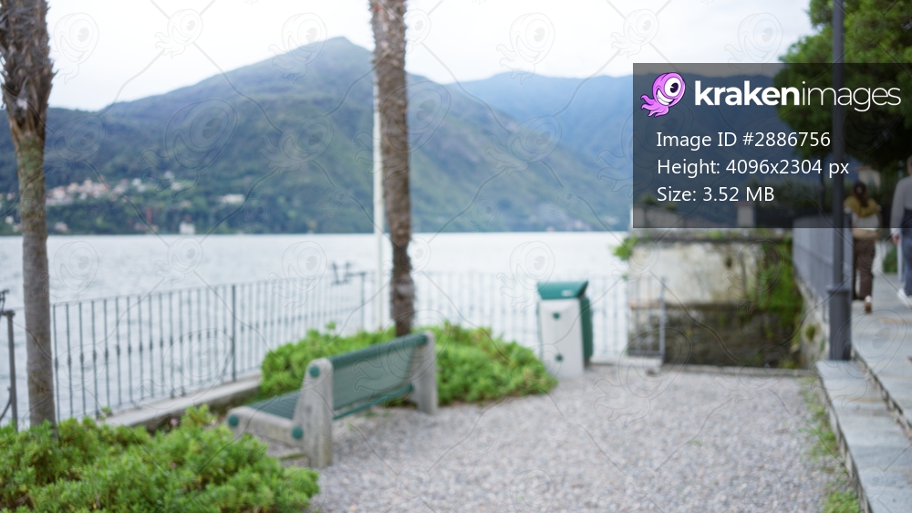 Lakeside promenade in soft blurred bokeh with benches, railing and distant mountains, park; background backplate copyspace calm.