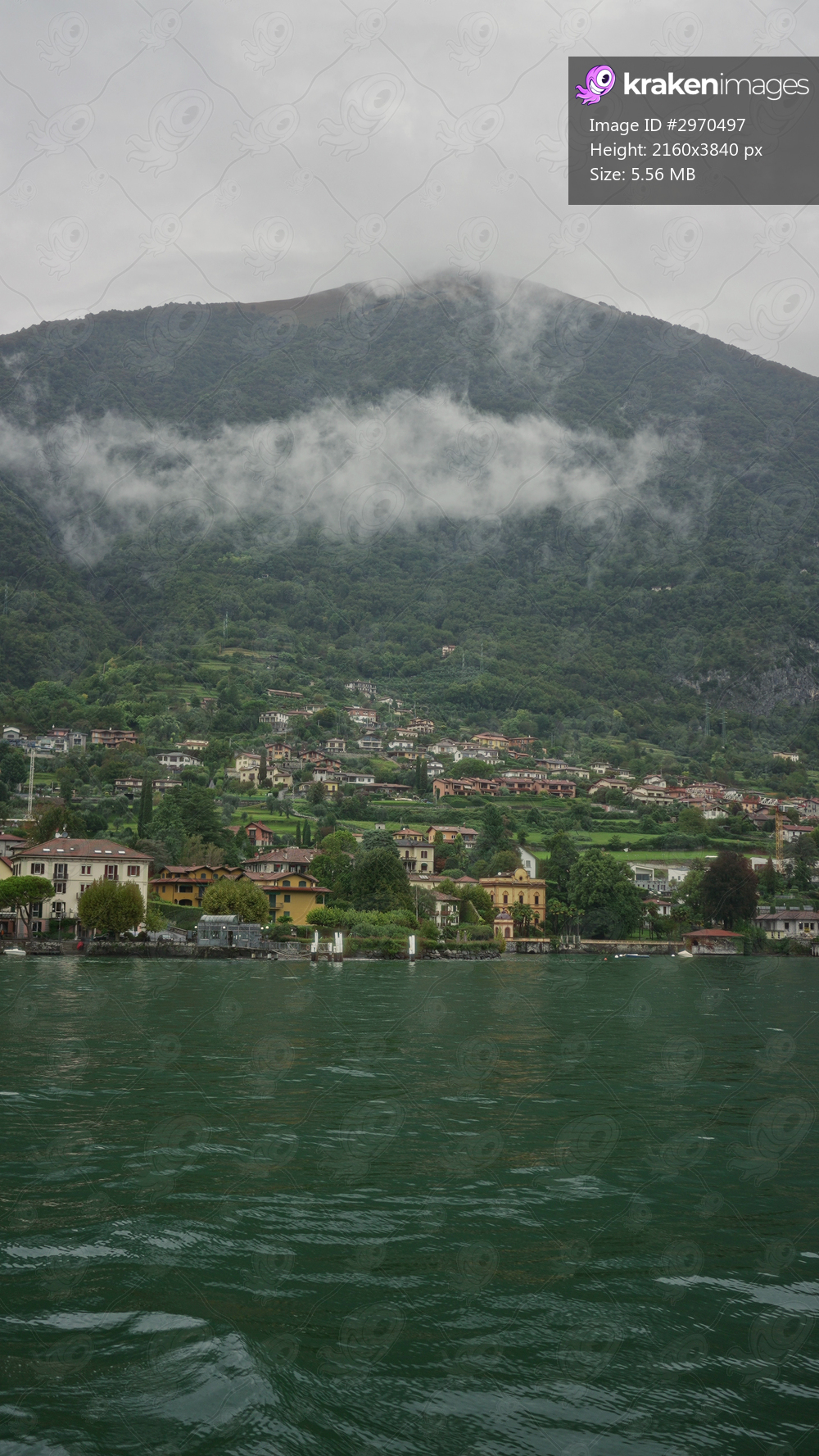 Lakeside village with waterfront buildings, rippling emerald lake water and low clouds clinging to the mountain slopes; serenity.