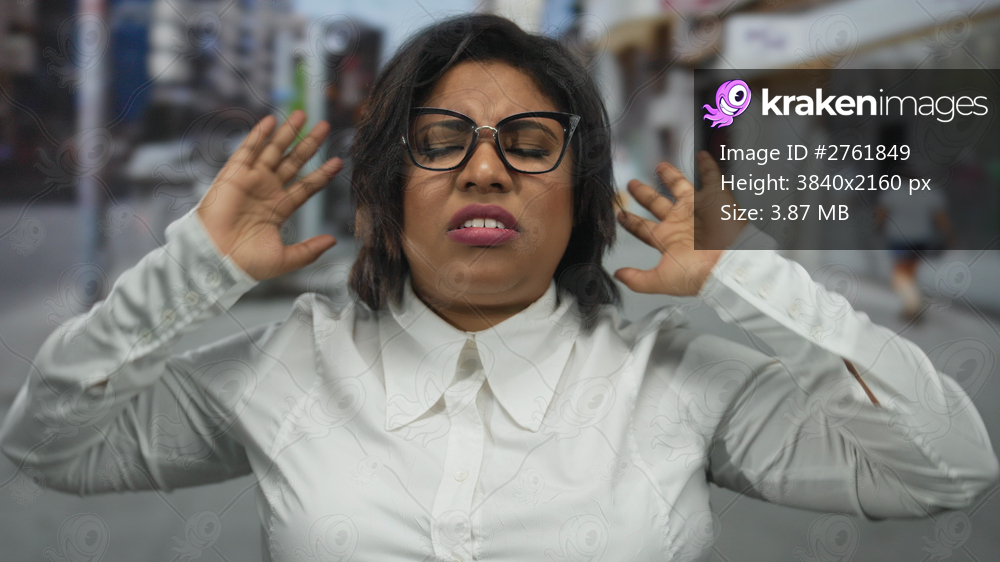Latin plus size woman with glasses on a city street looking frustrated outdoors in urban setting.