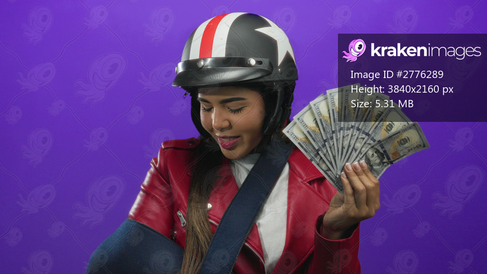 Latin woman with a helmet and arm sling holding us dollars against a purple background.