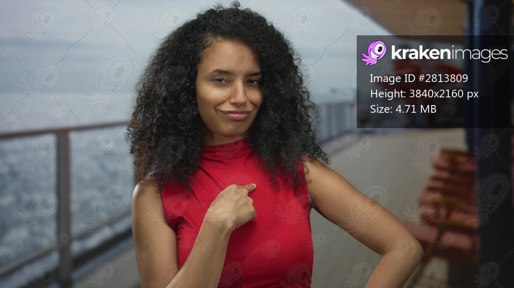 Latin woman with curly hair gently points finger to herself on sunlit boat deck near railing; confidence.