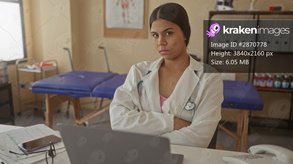 Latin woman doctor in pink blouse and white coat with stethoscope arms crossed behind desk in building; professionalism authority confidence rejection. - Kraken Images