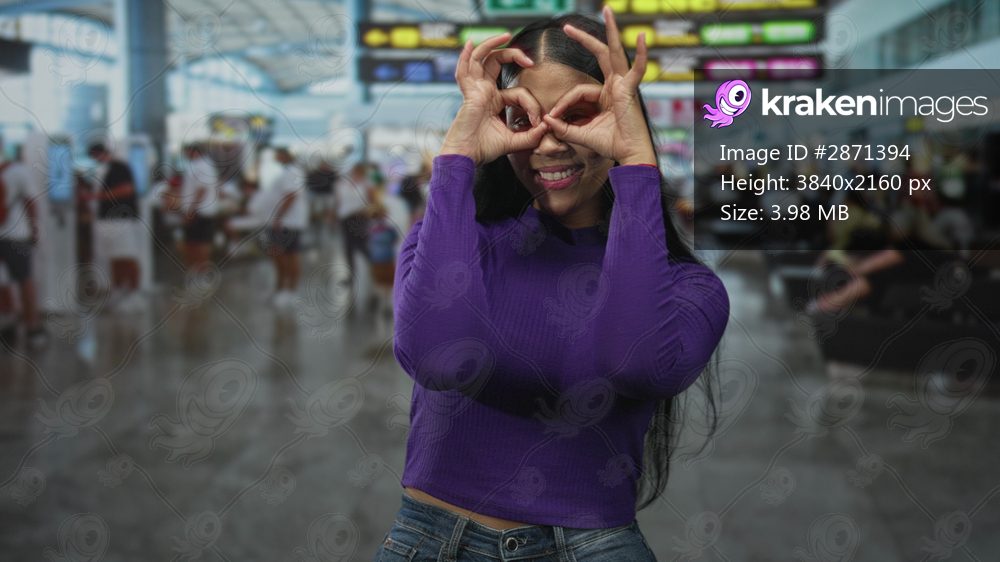 Latin woman face framed by hands in binocular gesture wearing purple shirt in busy airport terminal; curiosity.