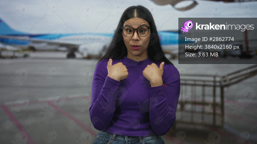 Latin woman gives thumbs up at outdoor airport terminal with airplane behind her; optimism celebration.