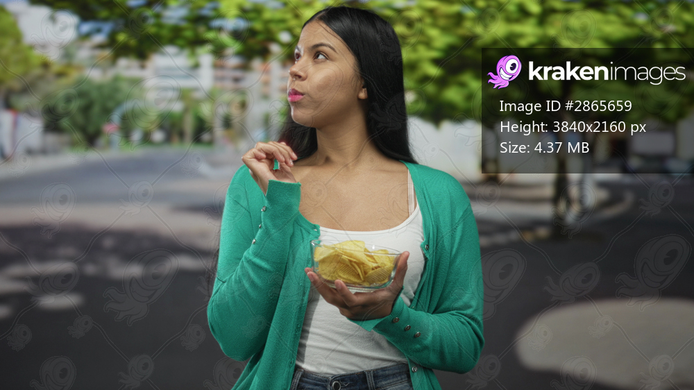 Latin woman holds chip to lips with a bowl of potato chips in hand on a city street; craving satisfaction.
