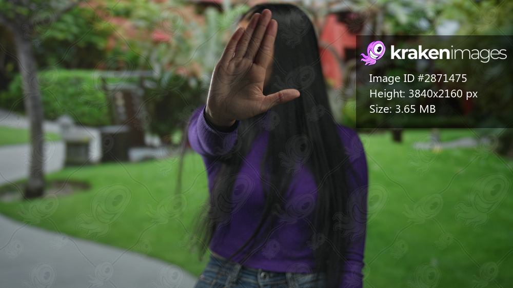 Latin woman holds her palm outward in a vibrant green outdoor park setting on a stone pathway in daylight; defiance.