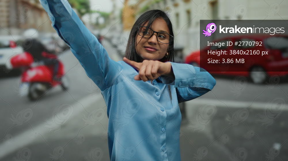 Latin woman in blue shirt points in excitement on urban street with red cars and blurred buildings in background, embodying youthful energy and urban setting. - Kraken Images