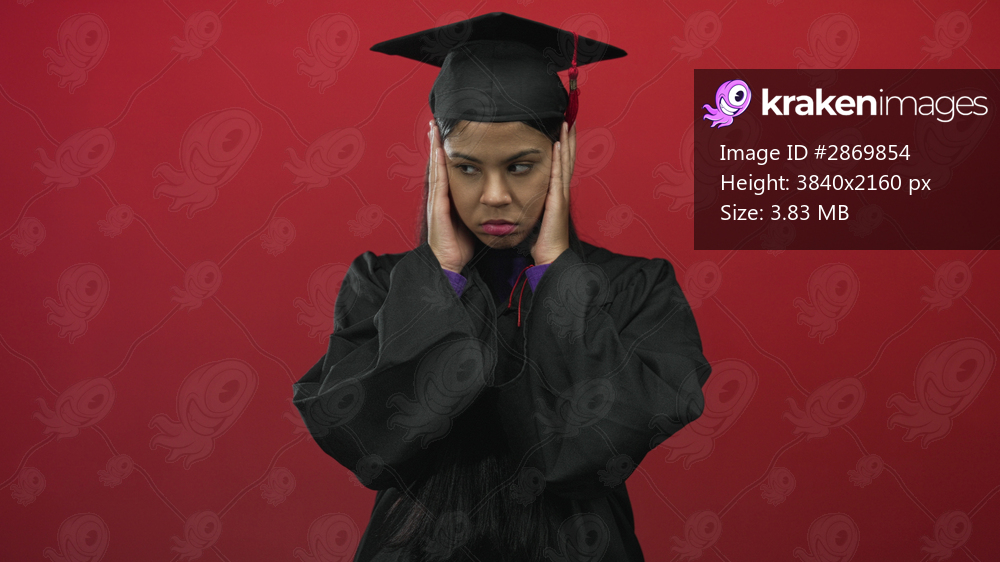 Latin woman in graduation gown holds head with hands at temples while eyes closed in red studio; frustration.