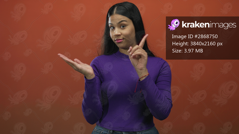 Latin woman in purple top subtly points finger to left palm against an orange studio backdrop; attention.