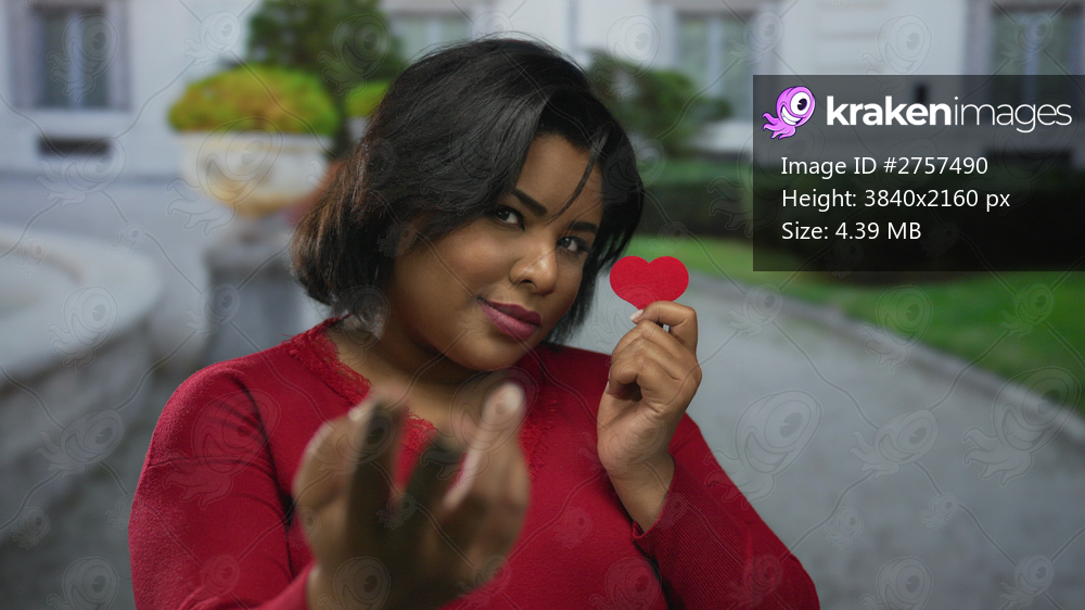 Latin woman in red holding paper heart on a city street makes a come here gesture expressing affectionate emotion outdoors.
