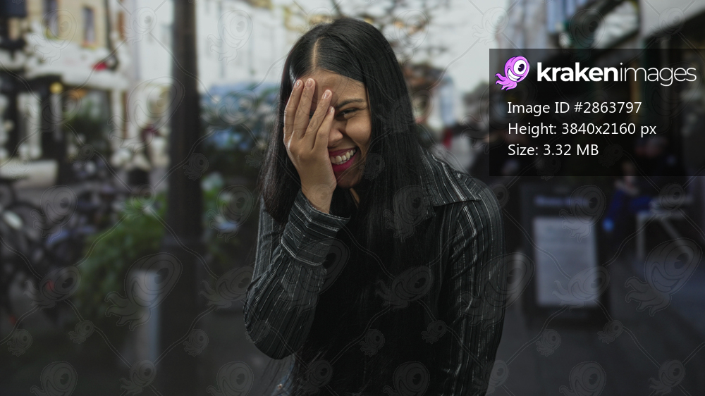 Latin woman with long dark hair covering her face with her hand on street while laughing in a candid moment; happiness.