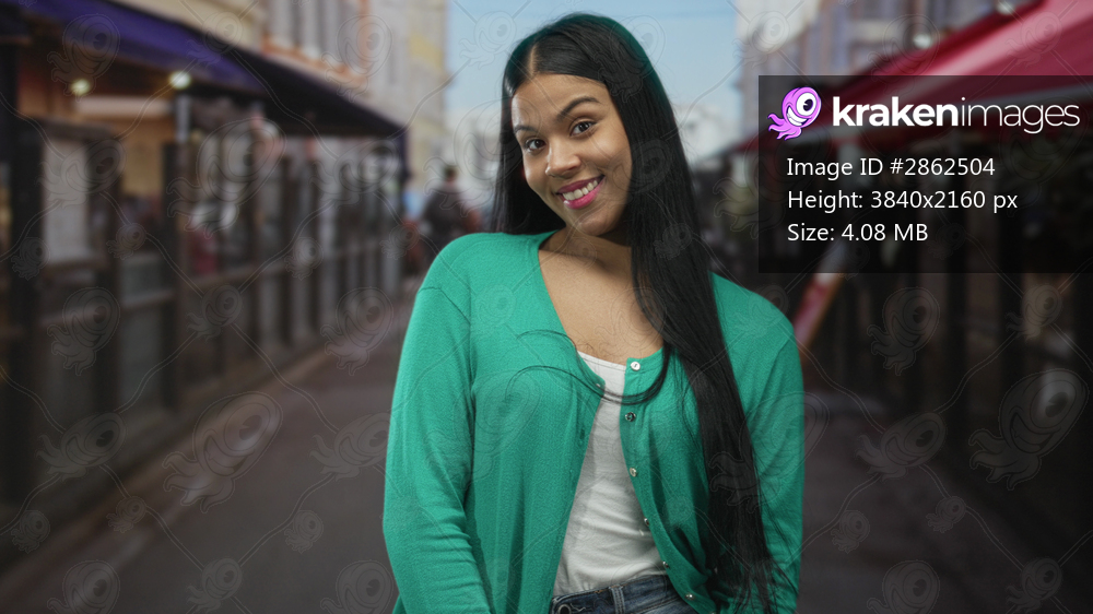 Latin woman with long dark hair in green cardigan smiles on city street outside cafe; confidence joy.