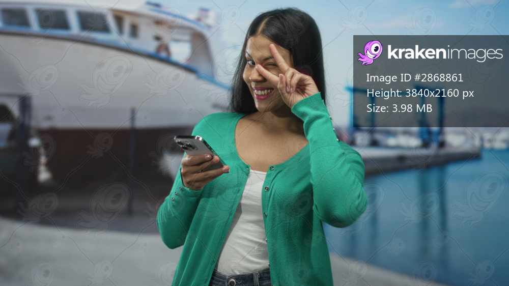 Latin woman on street by boat pier holds smartphone making peace sign near eye in bright daylight; joy.