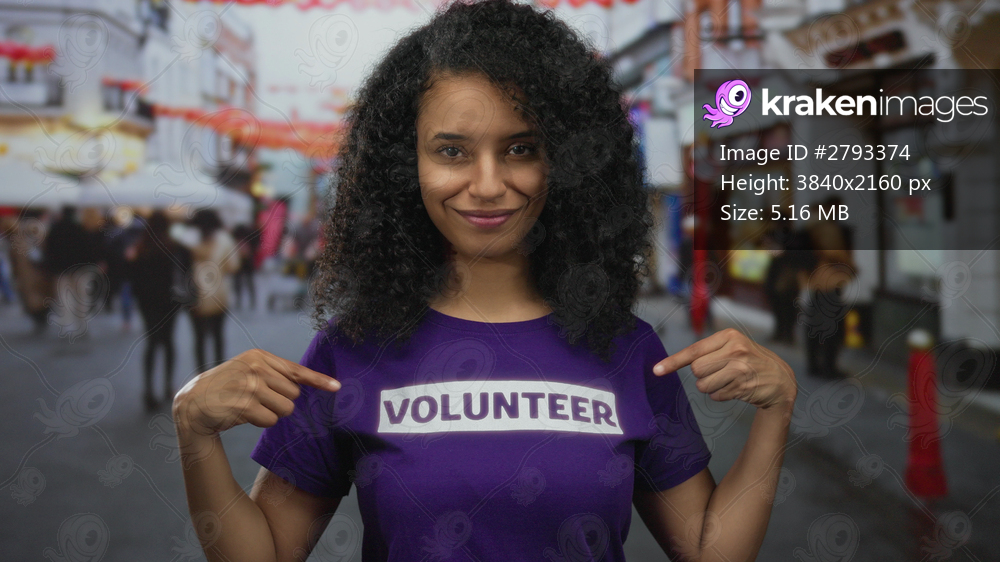 Latin woman points at purple volunteer shirt with thumbs up on busy city street during charity drive; pride duty.