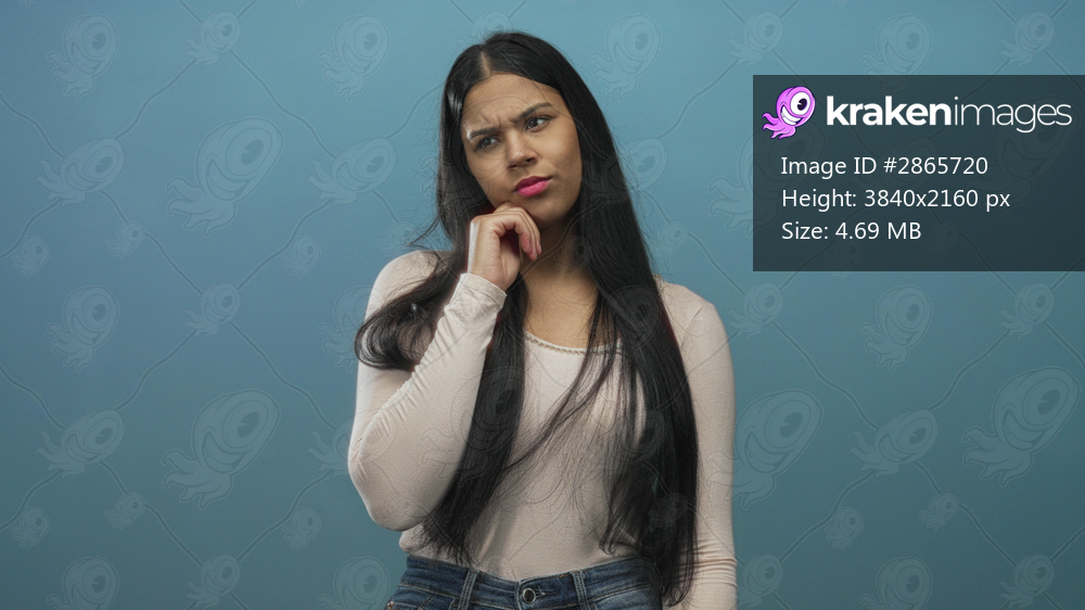 Latin woman poses with hand on chin in studio against blue wall, leaning slightly forward and tilting head; doubt.