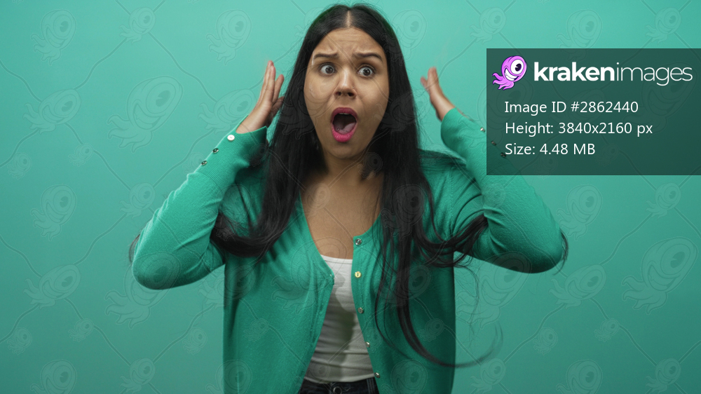 Latin woman with raised palms and open mouth showing surprise in studio with green backdrop; confusion.